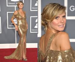 Heidi Klum struck a pose in an elegant gold gown. The draping was beautiful and luxurious, and she looked confident and comfortable.
